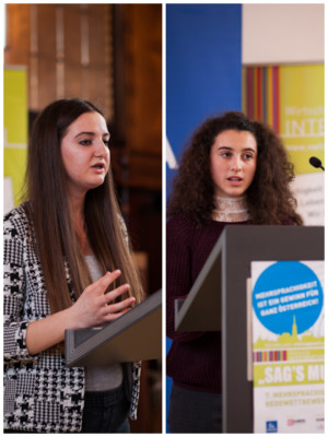 Anesa S. befasste sich in ihrer Rede (in Deutsch und Bosnisch) mit der Flüchtlingsproblematik in Österreich, Agnesa B. hat für ihre Rede (in Deutsch und Albanisch) ein Zitat von Rumi gewählt: „Sprich eine neue Sprache und die Welt wird eine neue Welt sein.“